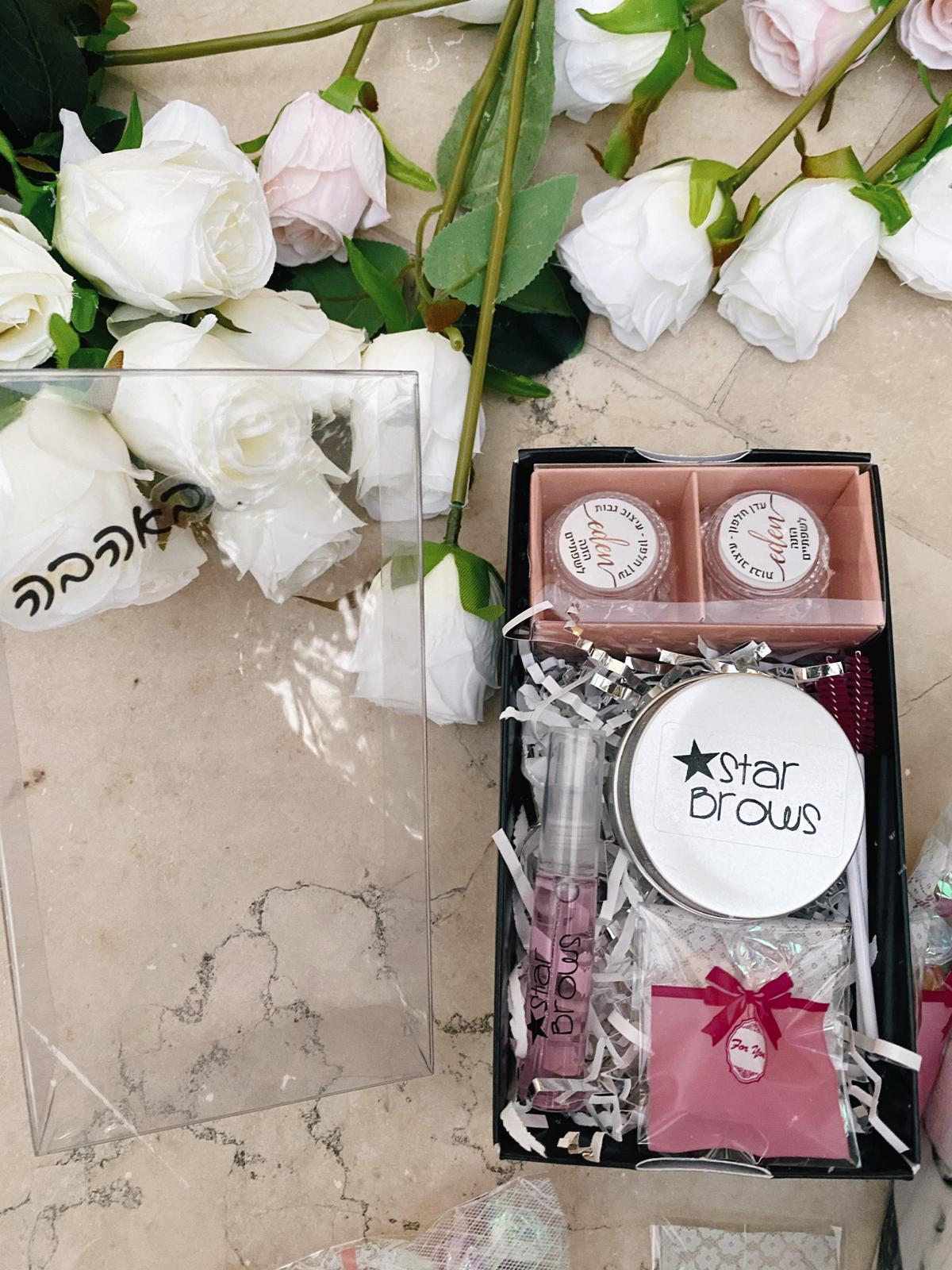 סבון גבות, שפריצר מקבע, שני מסרקי גבות, שני חמאות שיאה, ושני סוכריות לטעם טוב בפה!